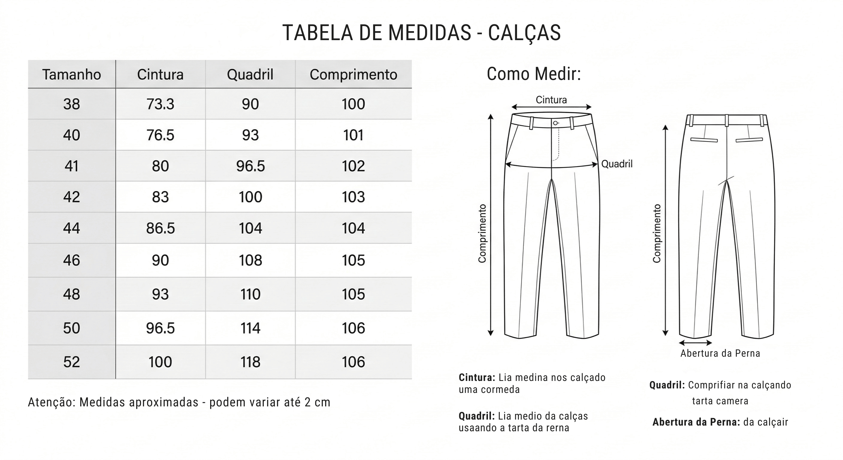 - Abertura da Perna: Meça a largura da barra da calça de um lado ao outro.